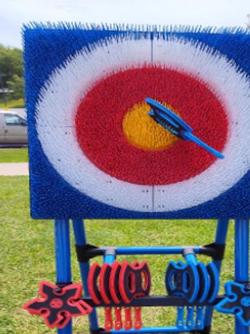 NERF shootout . use your NERF gun or ours. Aim for sharks mouth. includes 3 NERF guns and 25 darts (to be returned)